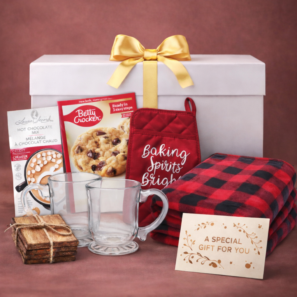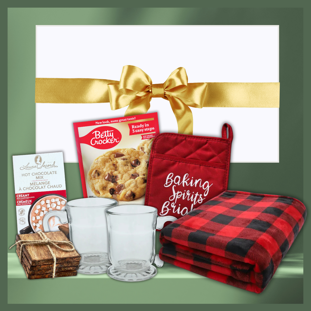 A Canadian Morning is an elegant gift set nestled in a pristine white box with a gold ribbon. It features a cozy blanket, a stylish mug set, coordinating coaster, Laura Secord hot chocolate mix, premium cookie mix, and a practical hot pad. This collection offers a perfect blend of comfort and indulgence, ideal for savoring quiet mornings or sharing warm moments.