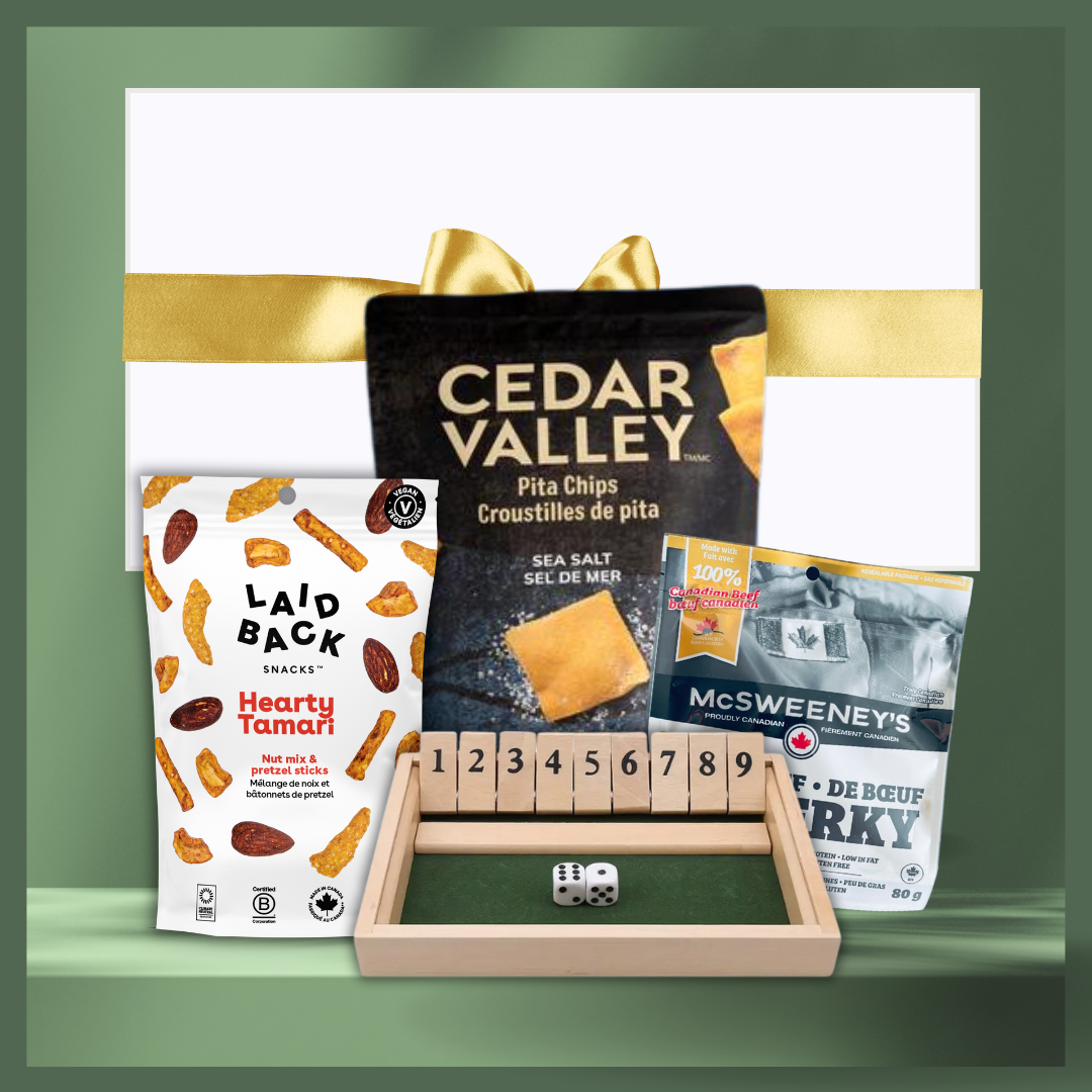 Shut The Box is a sophisticated gift set presented in a crisp white box tied with a gold ribbon. It features the classic dice game Shut the Box, paired with local pita chips, a flavourful nut mix, and authentic Canadian beef jerky. This collection combines engaging entertainment with gourmet snacks, making it an ideal gift for those who appreciate quality and classic fun.
