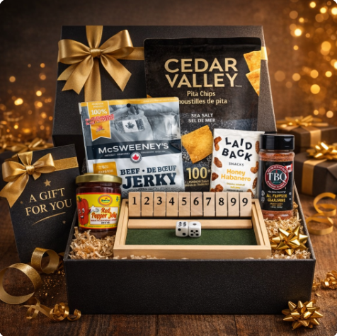 Shut The Box is a sophisticated gift set presented in a sleek black box tied with a gold ribbon. It features the classic dice game Shut the Box, paired with local pita chips, a flavourful nut mix, and authentic Canadian beef jerky. This collection combines engaging entertainment with gourmet snacks, making it an ideal gift for those who appreciate quality and classic fun.