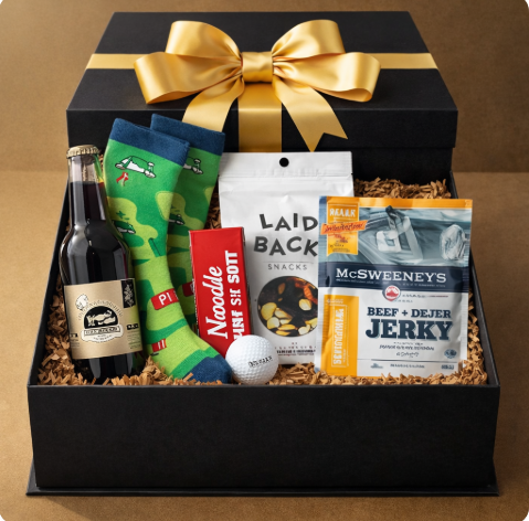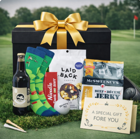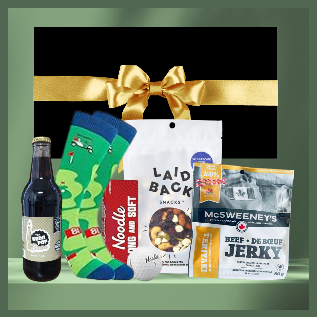 Presented in a stylish gift box wrapped with a smooth satin ribbon, this curated set is perfect for golf enthusiasts. It includes fun golf socks and high-quality golf balls to enhance comfort and performance on the course. Complementing the sporty essentials are savoury Canadian beef jerky, a nutritious nut mix, and a refreshing local soda, offering a well-rounded taste experience. Ideal for those who appreciate both quality gear and flavourful treats during their game.